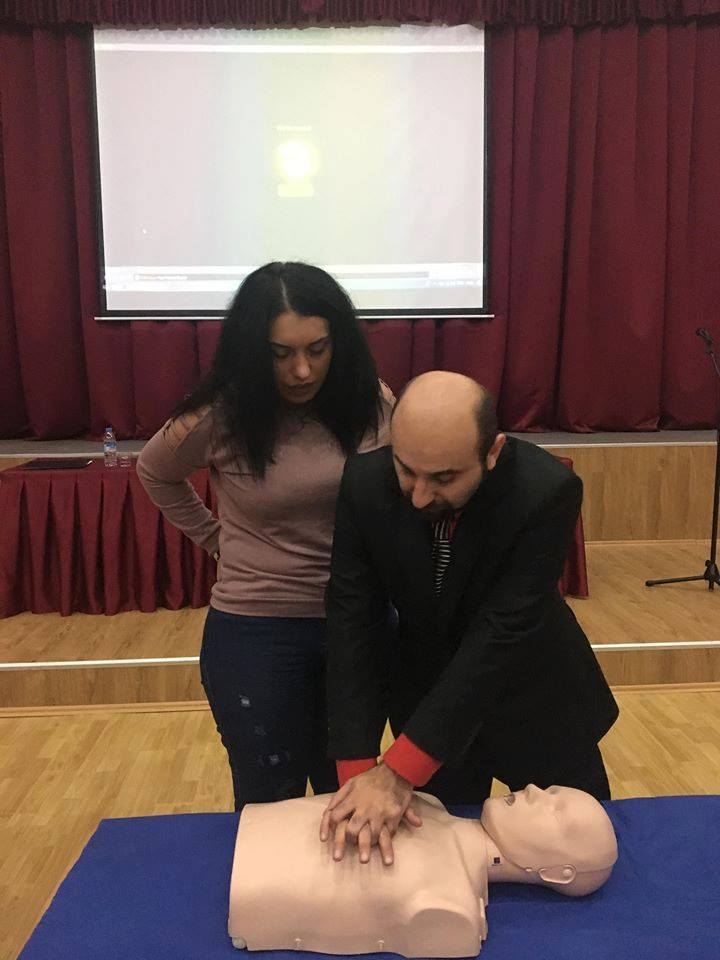 During the training, real environment was created.The trainer spoke about the importance of first medical aid. The training passed into interactive mode, students, vocational teachers and administyrative staff of the academy were actively involved in simulating process, where they carried out first medical aid activities, with the use of simulated tools.